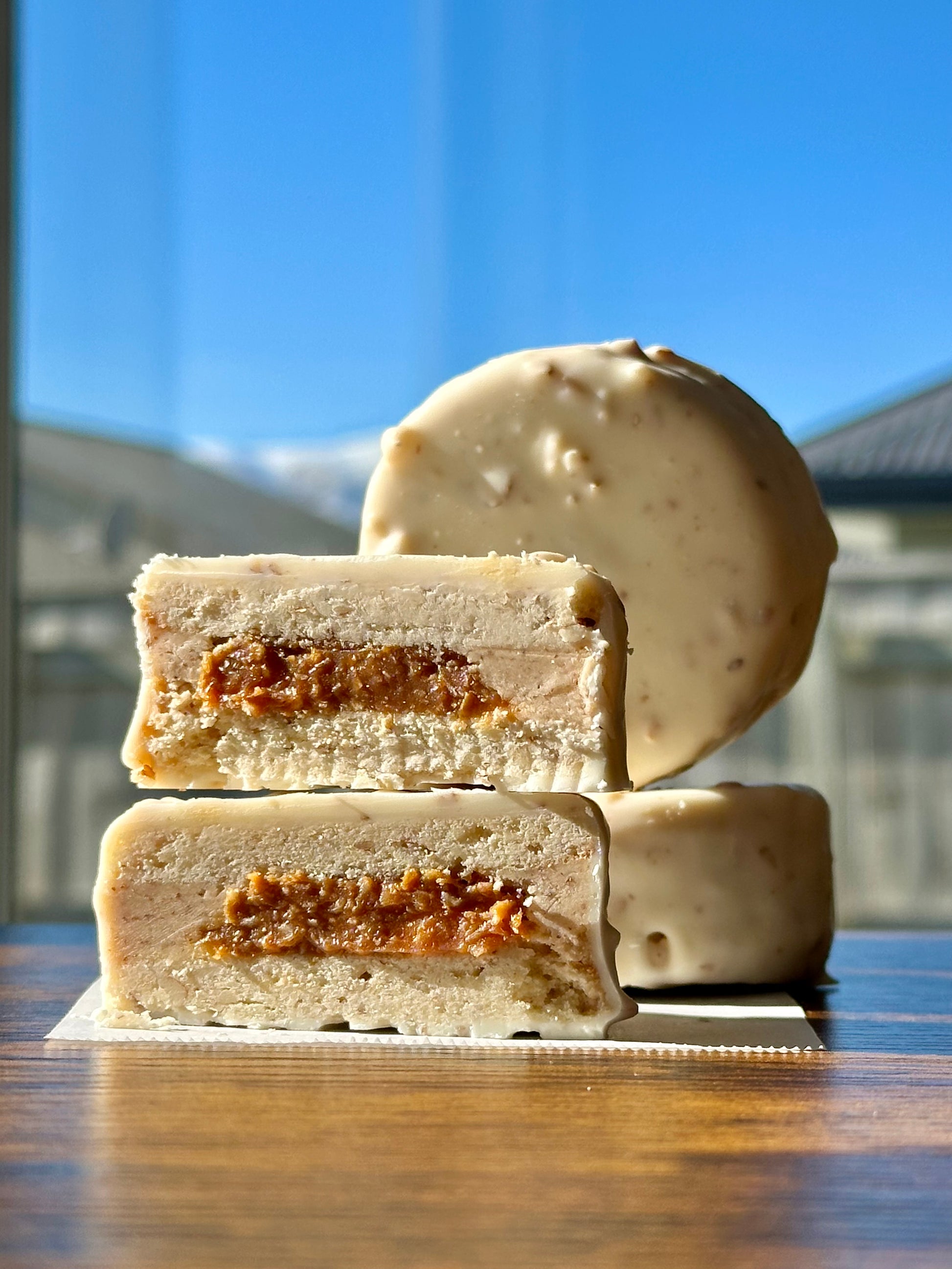 Almond cookie, almond butter ganache, coconut, dulce de leche, white chocolate