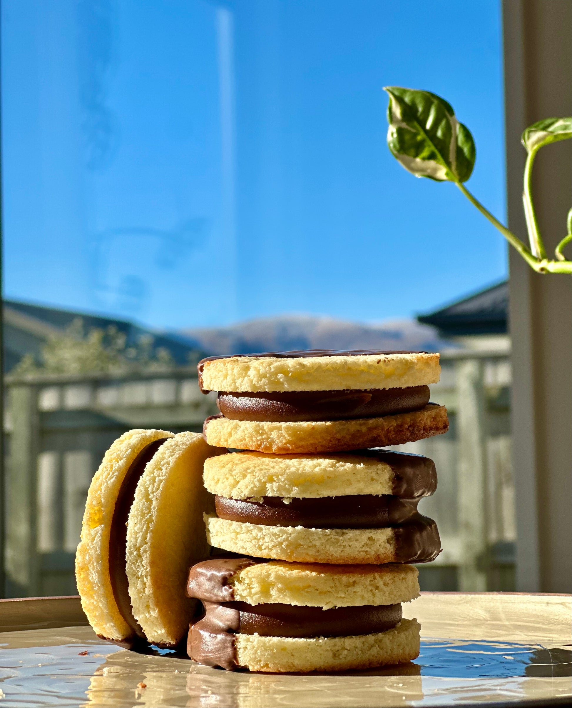 Coconut cookie, dulce de leche, semi-dipped in dark chocolate