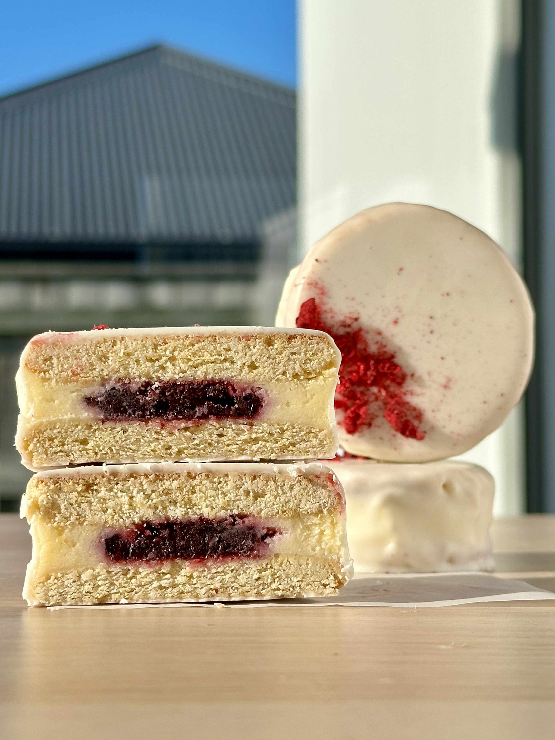 Citrus cookie, lemon ganache, berry center, white chocolate.