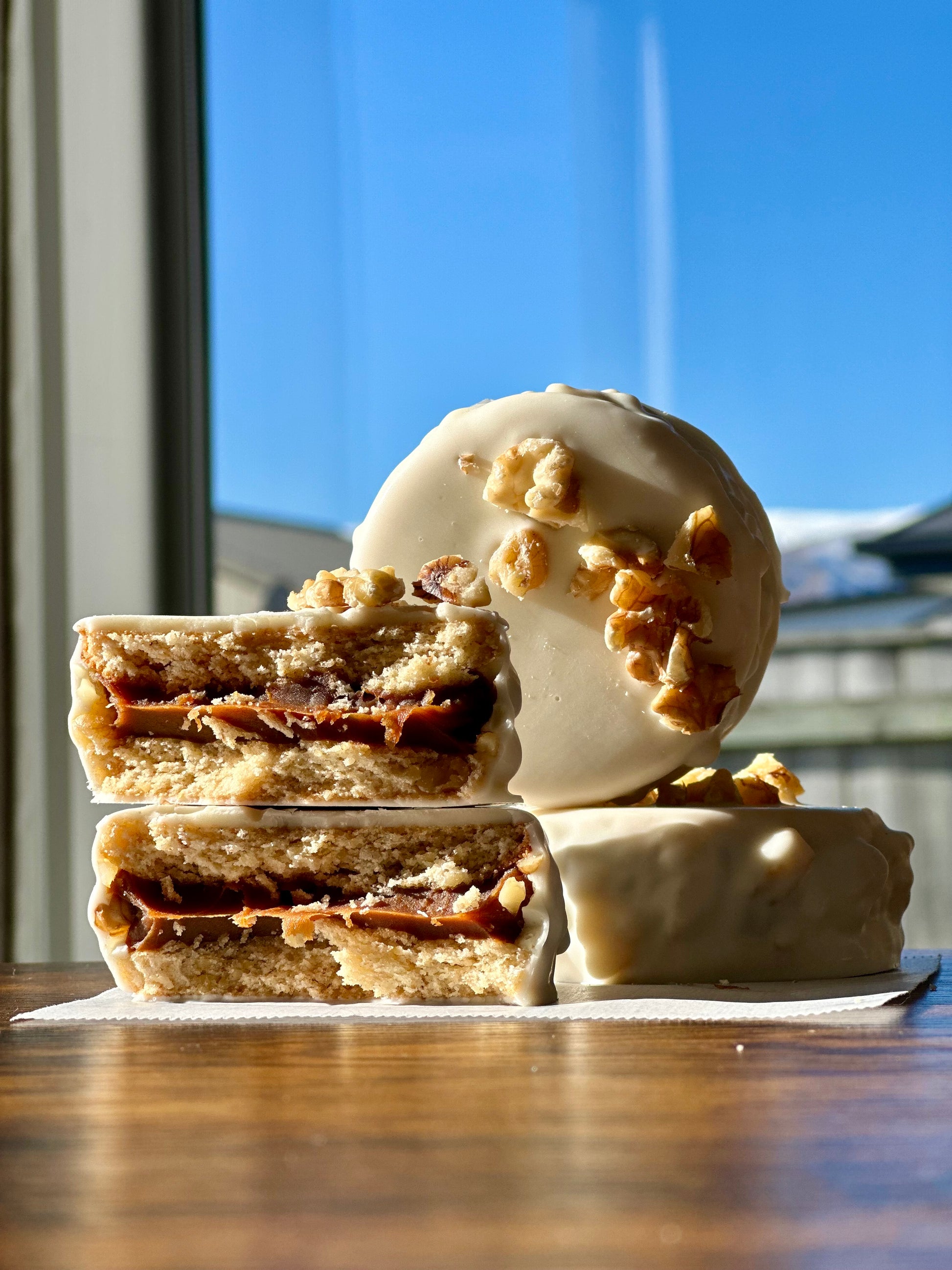 Walnut cookies, dulce de leche, white chocolate.